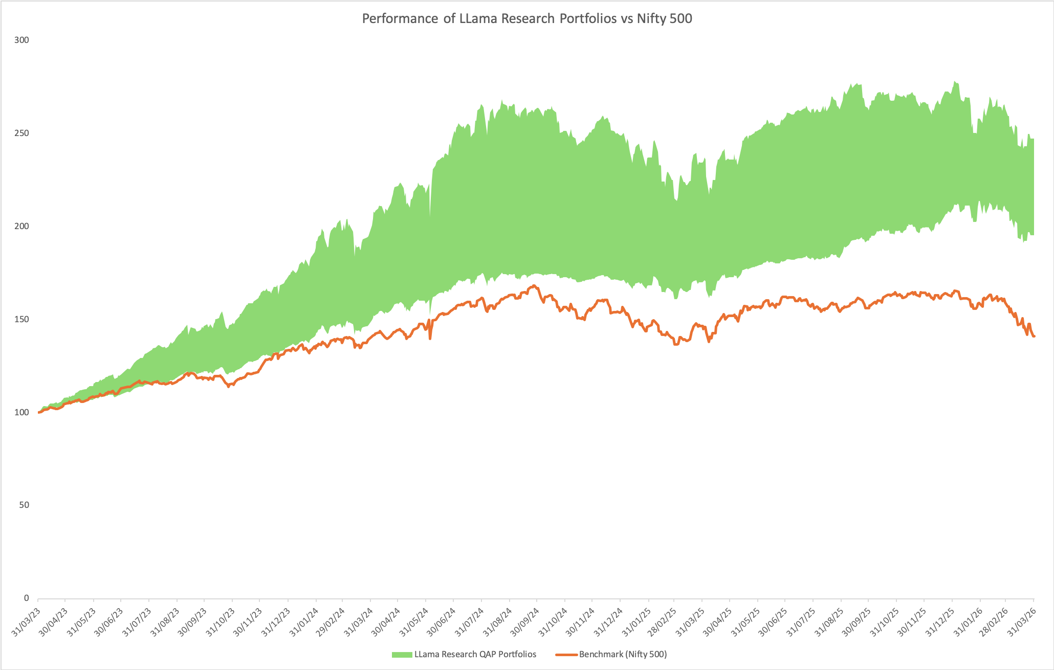 Disclaimer: Performance data is as of March 31st 2026, and reflects LLama Research’s internal live model portfolios. Actual client portfolios may vary based on individual goals, risk profiles, and mandates. These are multi-asset strategies, and comparisons to benchmarks like Nifty 50 and Nifty 500 are for reference only. The displayed performance is unaudited and subject to market conditions. Past performance is not indicative of future results, and no returns are guaranteed.
